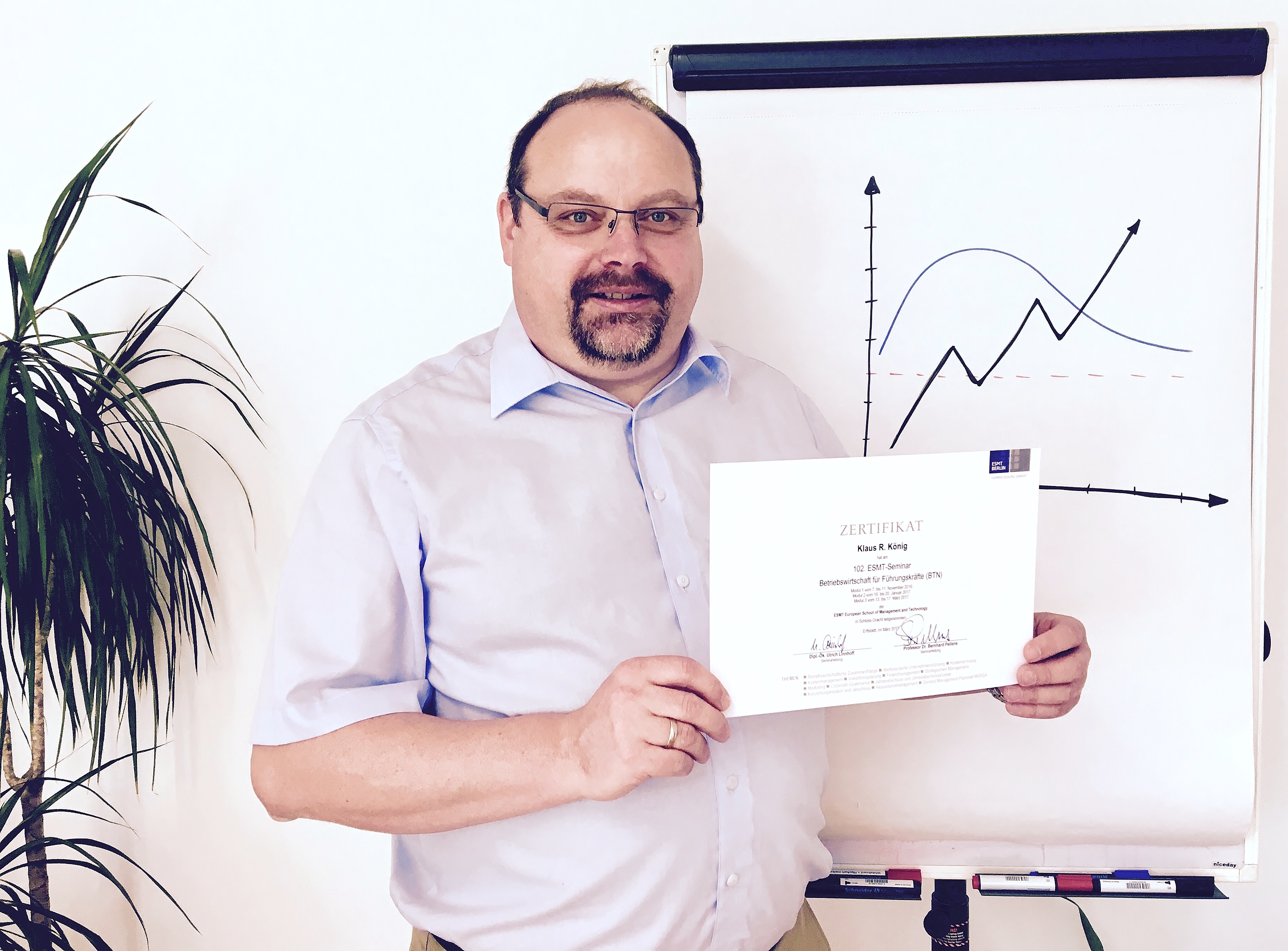 Insgesamt drei Wochen hat Diplomingenieur Klaus König noch einmal die Schulbank der European School of Management and Technology (ESMT) gedrückt, um bei dem Seminar ‚Betriebswirtschaft für Führungskräfte‘ auch die kaufmännische Sprache der Geschäftsführung zu lernen. „Die Erfahrung, die ich bereits aus über 20 Jahren in leitenden Positionen mitnehmen konnte, konnte ich durch das Seminar um fundiertes, theoretisches Fachwissen erweitern und an vielen Stellen vertiefen und verbessern“, berichtet Klaus König nach erfolgreicher Teilnahme.